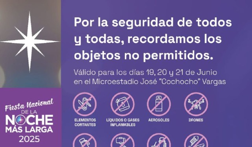 Dentro del listado que la Municipalidad propone para la seguridad de todas y todos los presentes en este gran festejo popular, figuran elementos cortantes, líquidos o gases inflamables, aerosoles, drones, termos, palo de “selfie”, equipo de mate, armas de fuego o pirotecnia, latas, drogas o sustancias ilegales, cinturones con hebilla, banderas con palos, perfumes, botellas de vidrio y encendedores. Asimismo, se solicita concurrir con su entrada, recordando que no podrá ser posible el reingreso al Microestadio.